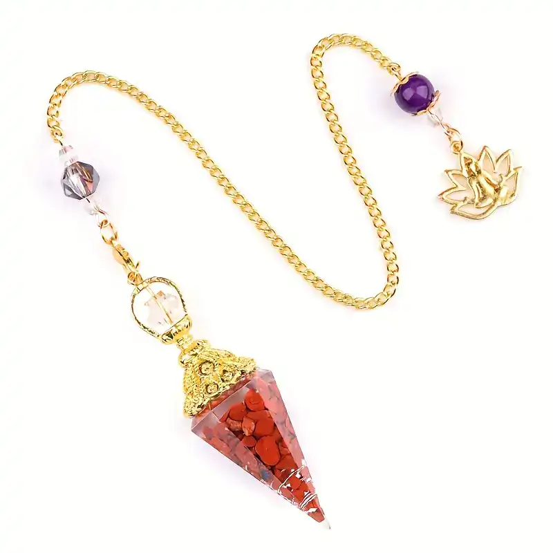 Son design raffiné associe une chaîne dorée ornée de perles et le symbole sacré du lotus, représentant pureté, élévation spirituelle et connexion à l’énergie universelle. Sa pointe équilibrée assure une sensibilité optimale aux ondes, permettant un travail énergétique fluide et efficace.