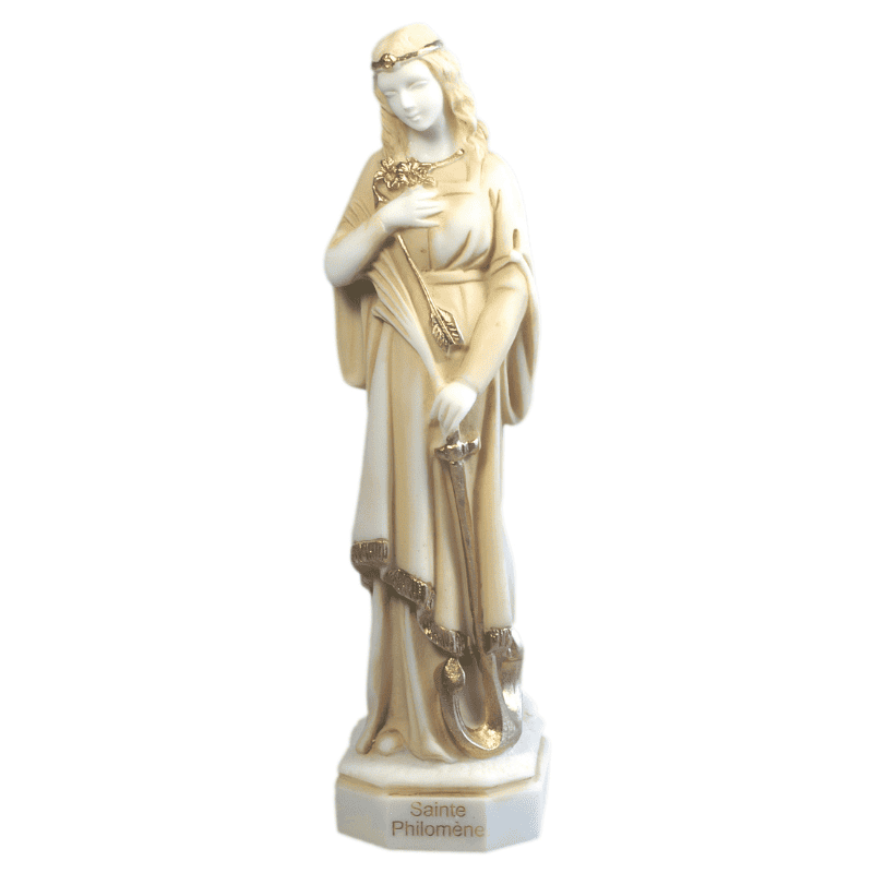 Sainte Philomène est un symbole de pureté et de force spirituelle. Cette statue accompagne les prières de protection et de foi.