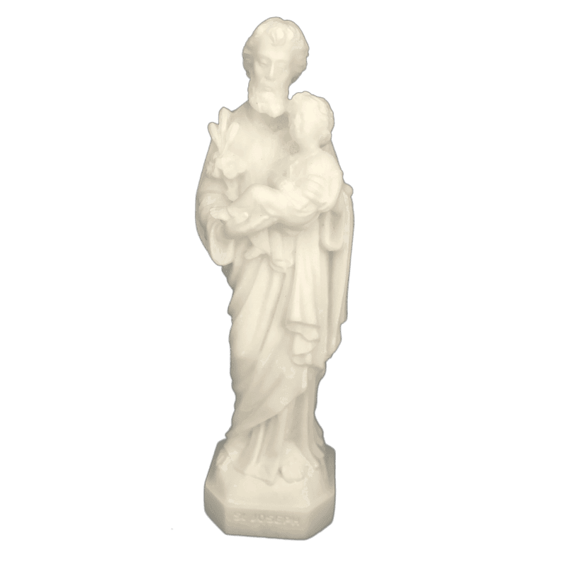 Saint Joseph, père nourricier de Jésus, symbolise la protection familiale et la sagesse humble. Cette statue invite à la confiance et à la stabilité spirituelle.