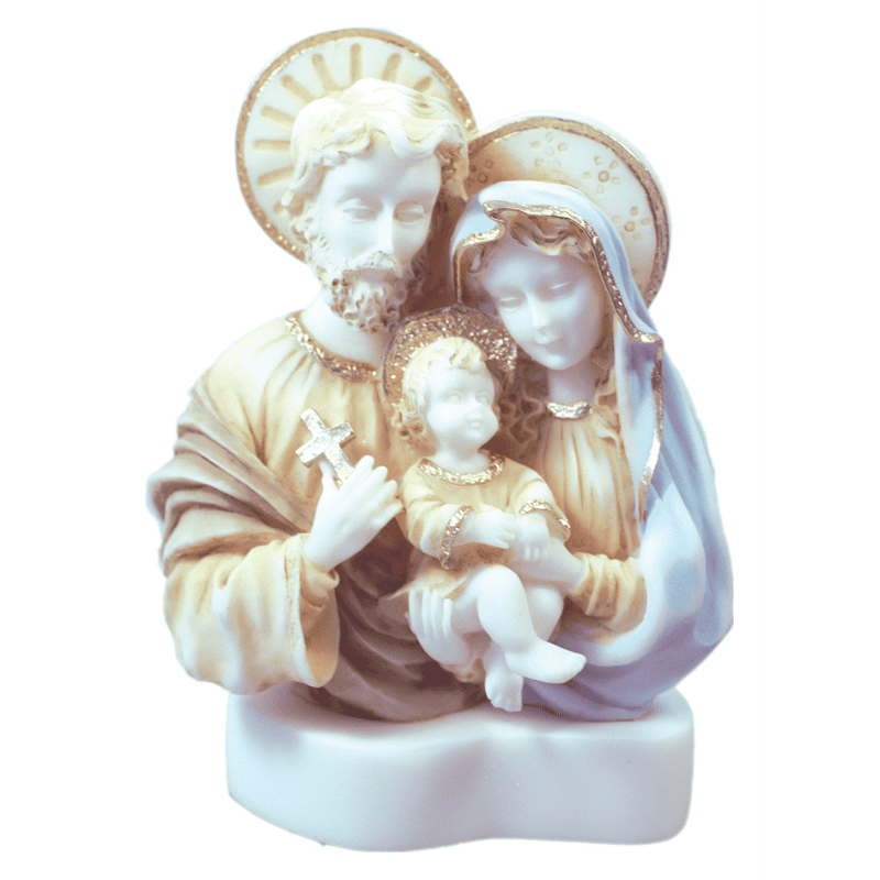La Sainte Famille entourée de l’Ange Gardien incarne la paix familiale et la protection divine. Cette statue invite à la sérénité et à la foi partagée.